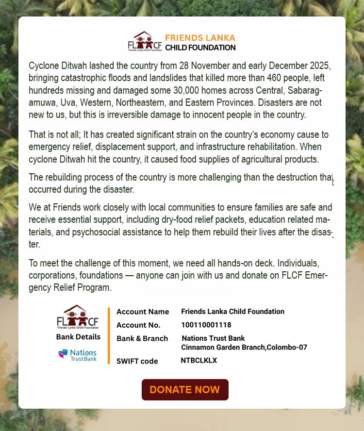 Originating from the Sri Lanka Mission of Friends Kinderhilfe International e.V. (FKI), which has been active in Sri Lanka since 2004, FLCF has a history of serving underprivileged children and families affected by the Tsunami. While the decision from FKI’s head office in Germany suggests no new projects under the FKI Sri Lanka Mission, they remain committed to providing funding support as needed. Consequently, the local team of FKI Sri Lanka Mission has transitioned into an independent local NGO, FLCF, leveraging its years of experience in implementing projects in Sri Lanka to embark on new initiatives.